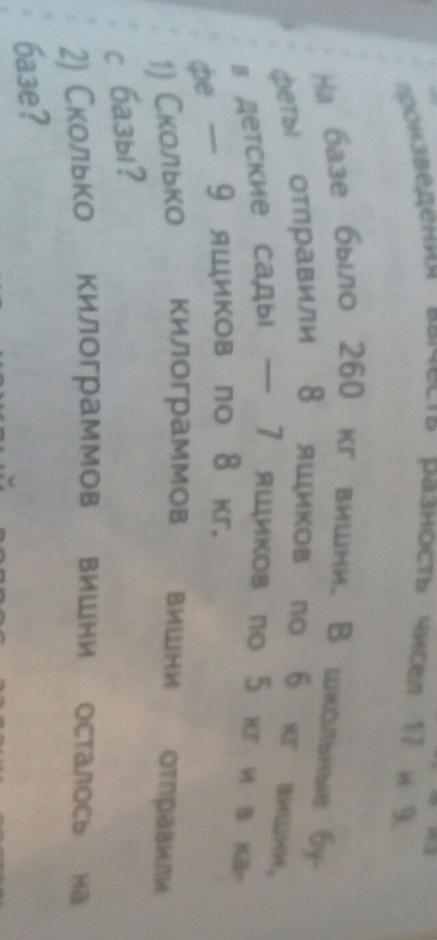 Ответ: 155 кг вишни отправили с базы, 105 кг вишни осталось на базе