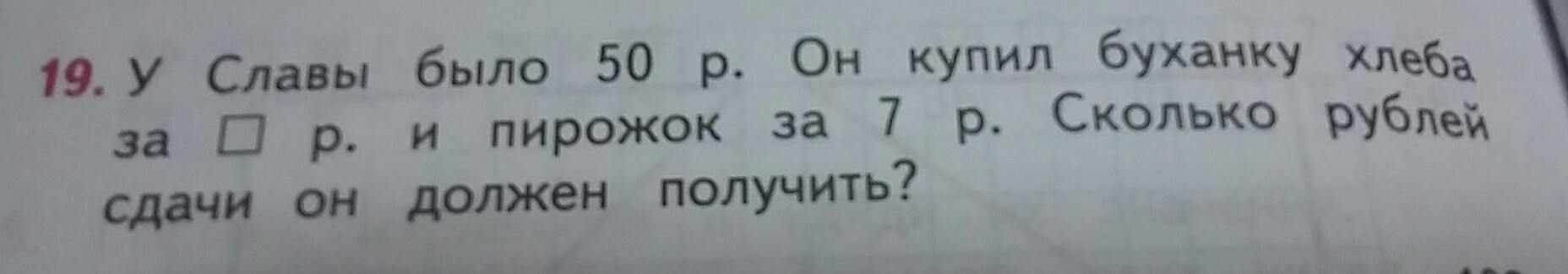 Было- 50 р. Хлеб- ? р. Пирожок - 7 р. Сдача- р. 1) 50-7=43( руб) стоит хлеб 2) 43 - 7=36( руб) заплатил всего 3) 50-36 =12 ( РУБ) Ответ: Славе дали сдачи 12 рублей УДАЧИ