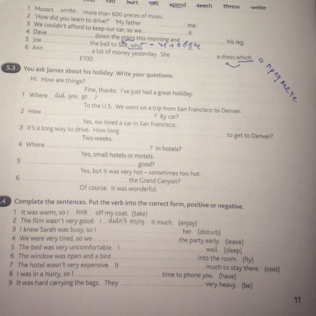 5.4 если это отрицательное предложение, то добавляешь did not (didn't). Далее мы видим слово в скобочках. Открываешь в учебника таблицу неправильных глаголов....нашел слово в первом столбике а потом смотришь как оно будет во втором столбике и пишешь....