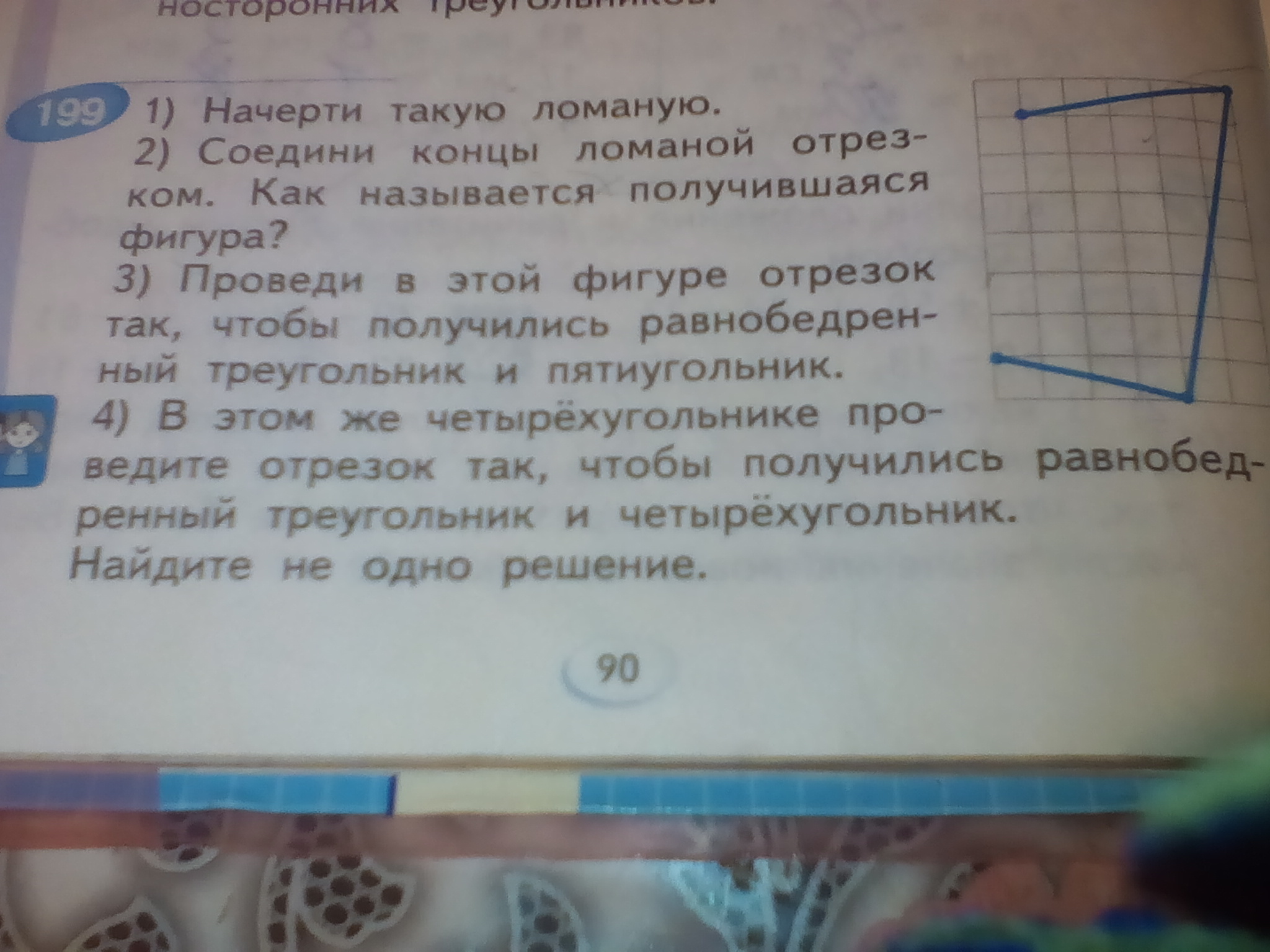 Начерти такую ломаную.Соединить концы ломоной отрезка. Провели в этой фигуре отрезок так чтобы получился равнобедренный треугольник и пятиугольник