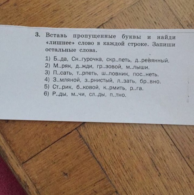 Беда , Снегурочка , скрипеть , деревянный . Лишнее слово скрипеть . Моряк , дожди , грозовой , малыши . Лишнее слово малыши . Писать , терпеть , шиповник , посинеть