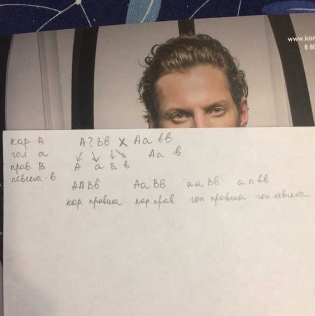 У человека карий цвет глаз доминирует над голубым, способность владению правой рукой над левой. Кариглазый голубоглазый правша гетерозиготный по второму признаку, женился на кариеглазой левше гетерозиготной по первому признаку. Каких детей можно ожидать от данного брака?