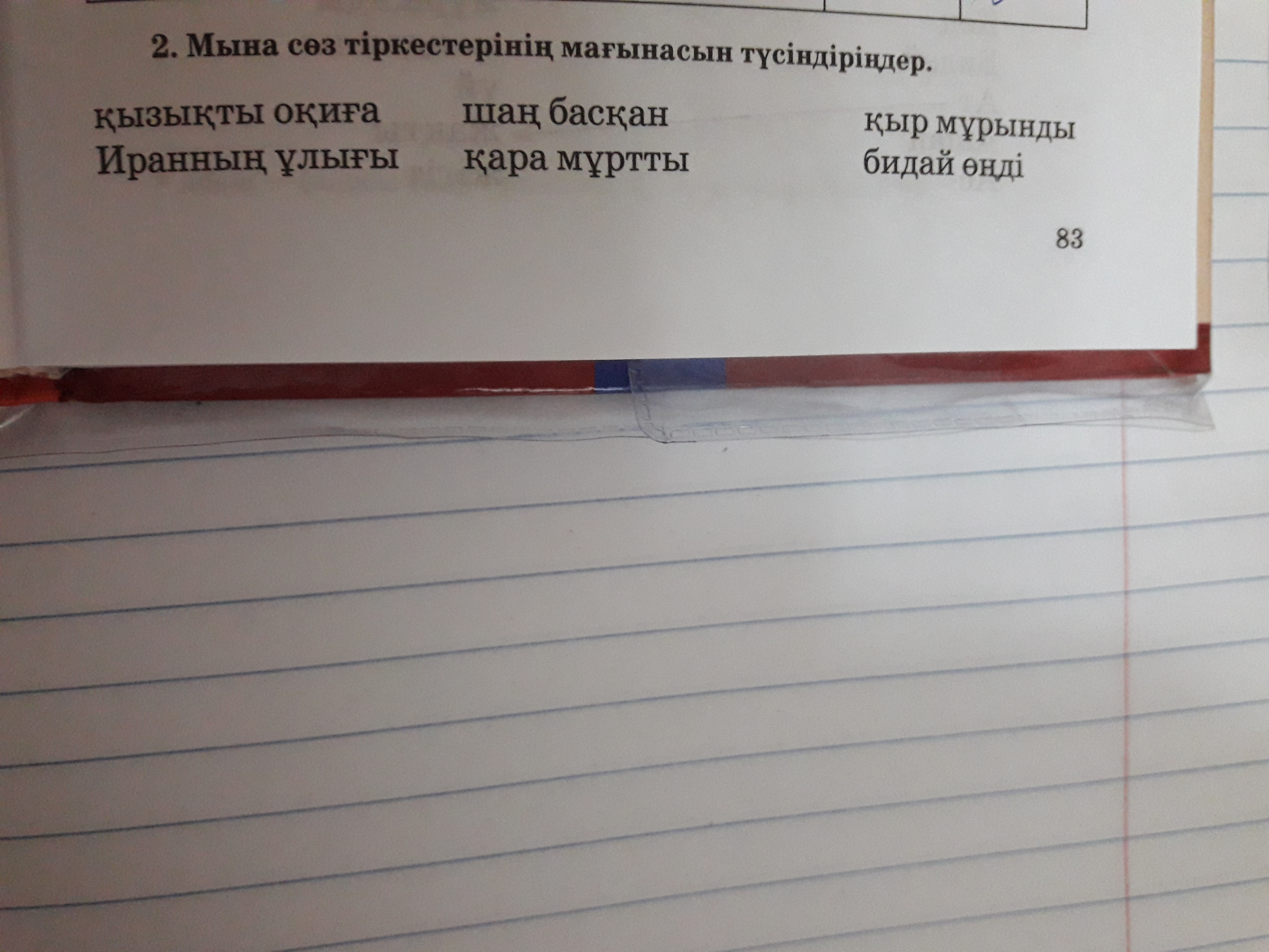 Сөз тіркестеріне мағынасын түсіндіріңдер . Қызықты оқиға , Иранның ұлығы, шаң басқан, қара жұртты, қыр мұрынды, бидай өнді