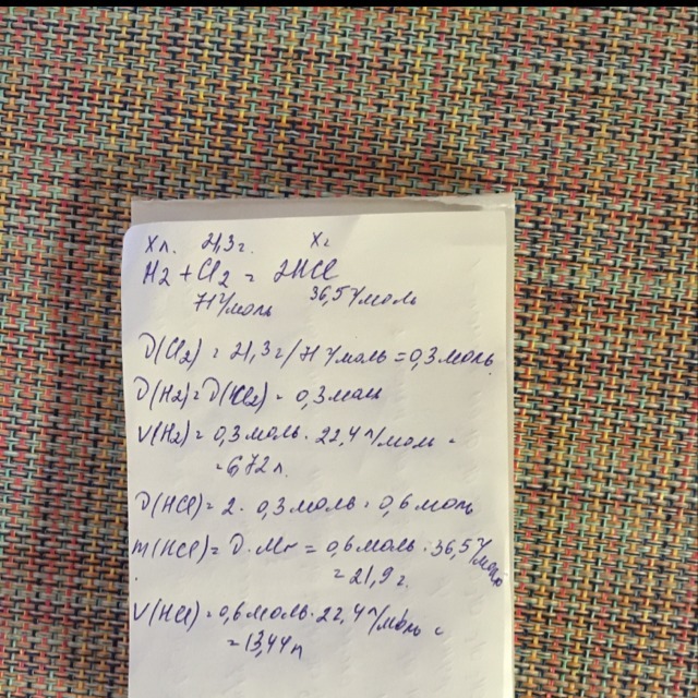 определите массу и объём образовавшегося хлороводорода если в реакцию с водородом вступает хлор массой 21,3г. Какой объем водорода для этого необходим ?