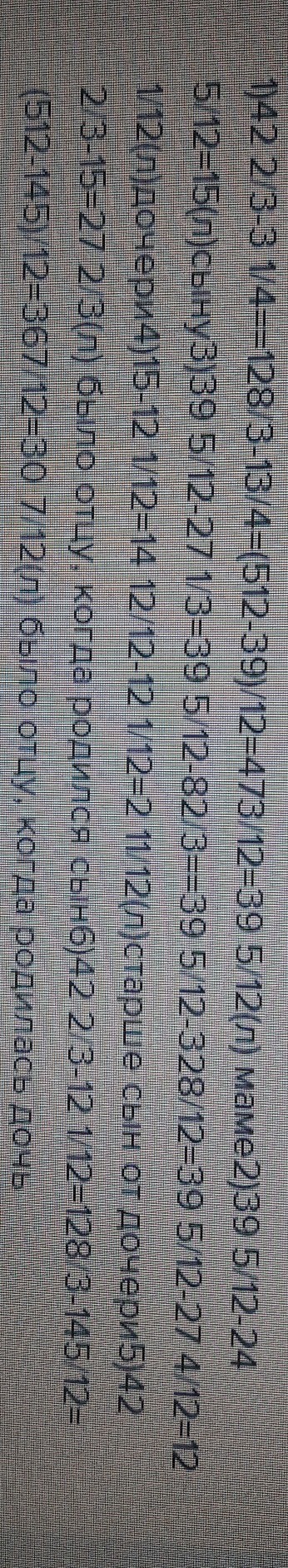 Отцу 42 целых 2/3 года. А мать моложе отца на 3 целых 1/4 лет. Когда родился сын, матери было 24 целых 5/12 года, а когда родилась дочь 27 целых 1/3 лет. 1) сколько сейчас лет сыеу и дочери? 2) на сколько лет сын старше дочери? 3) сколько лет было отцу, когда родились его сын и дочь?