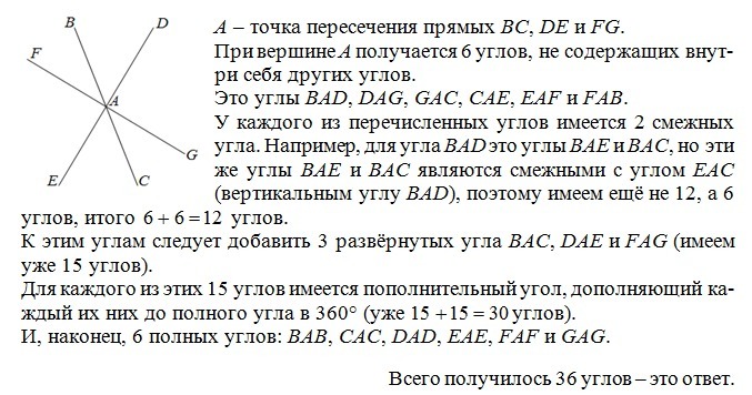проведите через одну точку три прямые. сколько при этом углов образовалось. рассматриваются углы с вершиной а точке пересечения прямых.