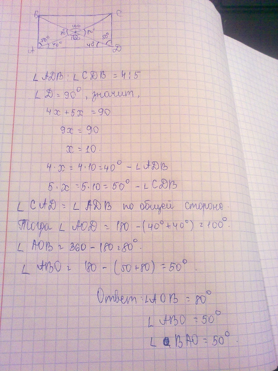 В прямоугольнике АВСД АС и ВД диогонали которые пересекаются в точке О. Угол АДВ : угол СДВ =4:5.Найти углы треугольника АОВ.