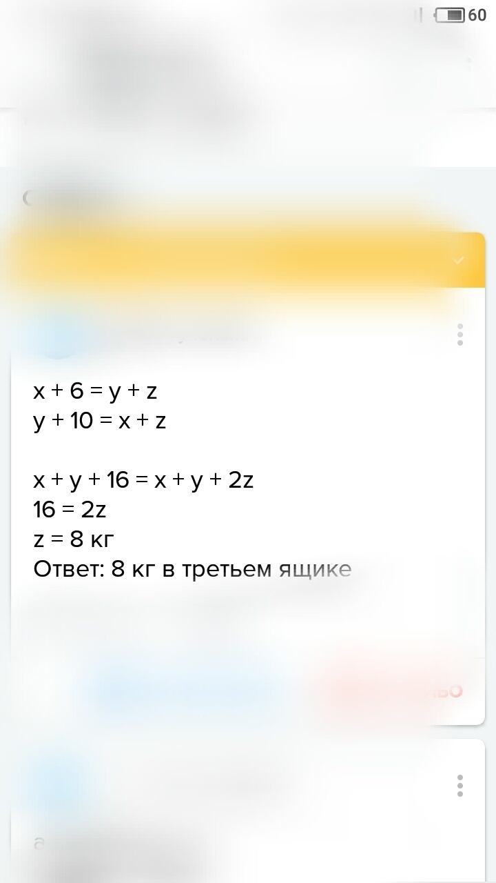 У трьох кошиках лежать горіхи. У першому на 6 горіхів менше, ніж у двох інших разом. У другому на 10 менше , ніж у першому і третьому разом. Скільки горіхів у третьму кошику?