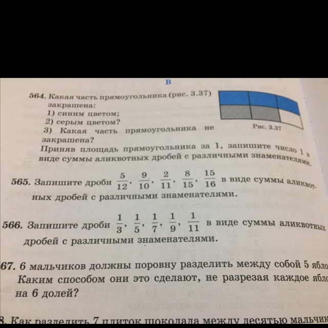 Запиши дроби 5/12, 9/10, 2/11, 8/15, 15/16 в виде суммы аликвотных дробей с различными знаменателями.