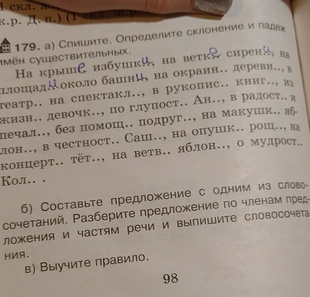 на (чём?) на ветке П.п,избушки нет чего избушки Р.п, на чём на крыше П.п сирени нет чего сирениР.п,площади нет чего площади Р.п