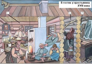 Крестьянская изба конца 16 века: большую часть комнаты занимала печь, служащая, как для обогрева, так и для приготовления пищи. Большинство крестьянских изб топились "по-черному".