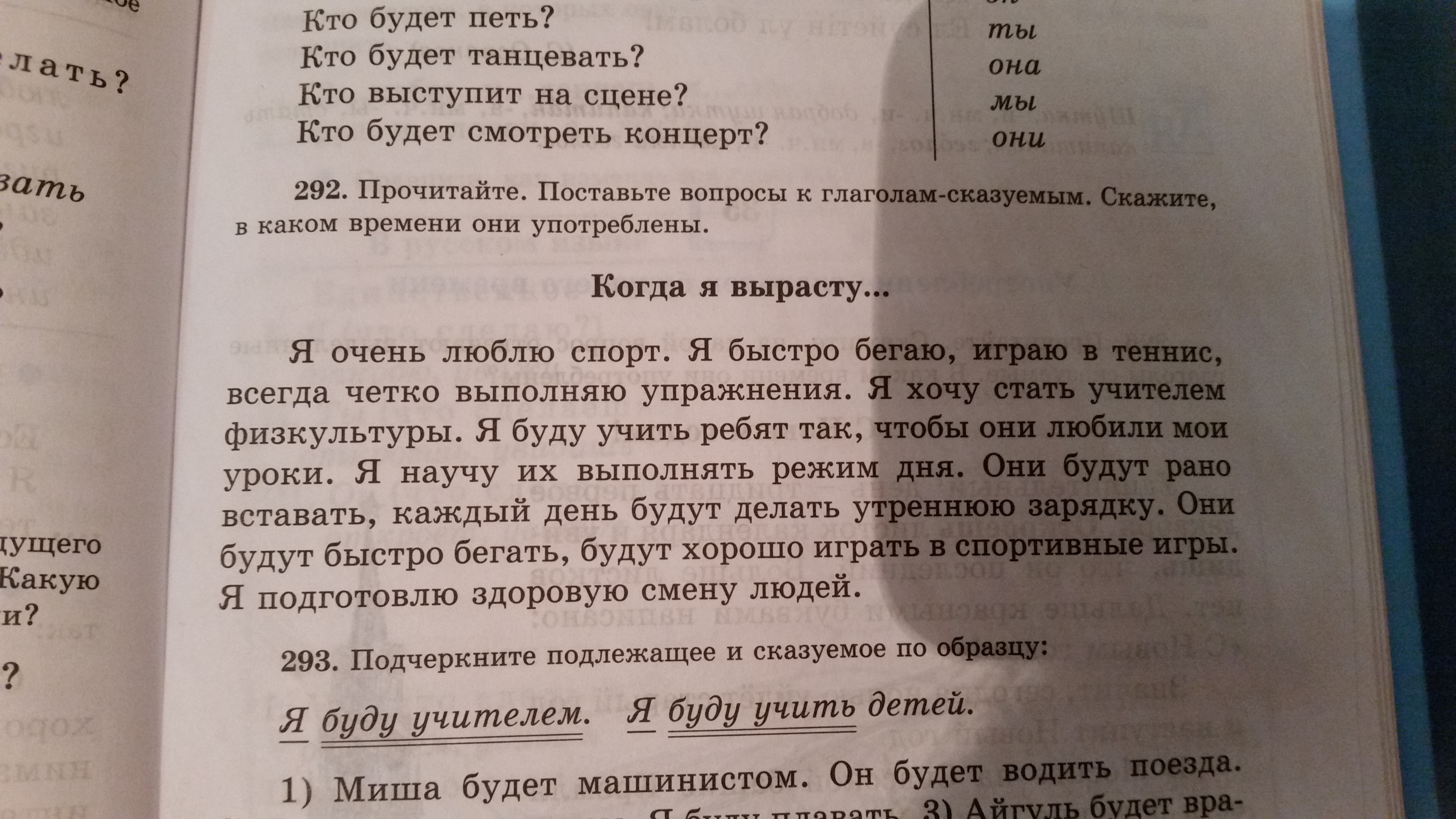 Ты любишь спорт? Настоящее время, Ты быстро бегаешь? Настоящее время, Ты играешь в теннис? Настоящее время, Ты всегда чётко выполняешь упражнения? Настоящее время, Ты хочешь стать учителем физкультуры? Будущее время, Ты будешь учить ребят так, чтобы они любили твои уроки? Будущее время, Ты научишь их выполнять режим дня? Будущее время, Они будут рано вставать? Будущее время, Они будут каждый день делать утреннюю зарядку? Будущее время, Они будут быстро бегать? Будущее время, Они будут хорошо играть в спортивные игры? Будущее время, Ты подготовишь здоровую смену людей? Будущее время.