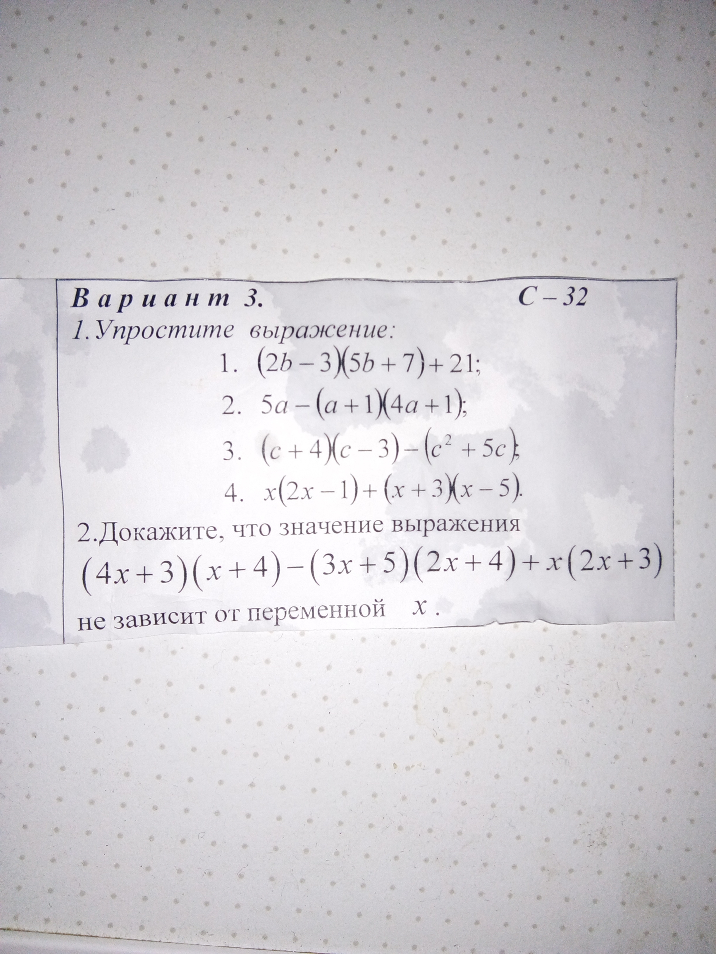 1)10b(2)-b 2)-4a(2)-1 3)-4c 4)3x(2)-3x-15 2. при раскрытии скобок все х сократятся и останется -8 поэтому это выражение не зависит от переменной х