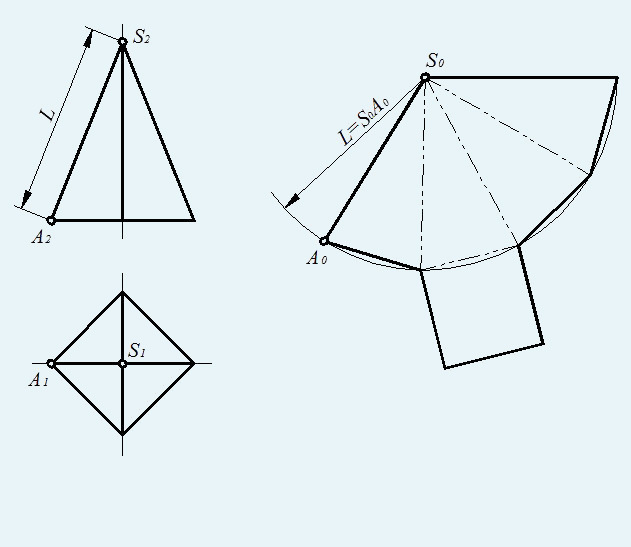 Радиусом равной длинны стороны треугольника = 9 построить окружность, центр окружности это вершина пирамиды So. И выбрать произвольную точку на окружности, от неё радиусом равной одной из длин квадрата =12 отложить четыре отрезка как на картинке. Соединить концы отрезков с вершиной. Затем от второго отрезка построить квадрат заданной длины. После вырезать все по внешнему контуру. В местах показаной пунктирной линией сделать сгиб. Соединить и склеить. Но чтобы клеить, надо немного удлинить края развёртки.
