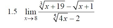begin{array}{l}<br />lim limits_{xto 8}frac{sqrt[3]{x+19} -sqrt{x+1} }{sqrt[5]{4x} -2} \<br />\<br />text{Lopital}\<br />frac{frac{d}{dx} (sqrt[3]{x+19} )-frac{d}{dx} (sqrt{x+1} )}{frac{d}{dx} (sqrt[5]{4x} )-frac{d}{dx} (2)} \<br />lim limits_{xto 8}frac{frac{sqrt[3]{x+19} }{3x+57} -frac{1}{2sqrt{x+1} } }{frac{sqrt[5]{4x} }{5x} -0} \<br />frac{frac{sqrt[3]{8+19} }{3times 8+57} -frac{1}{2sqrt{8+1} } }{frac{sqrt[5]{4times 8} }{5times 8} } =frac{frac{3}{81} -frac{1}{6} }{frac{2}{40} } =-frac{70}{27} <br />end{array}