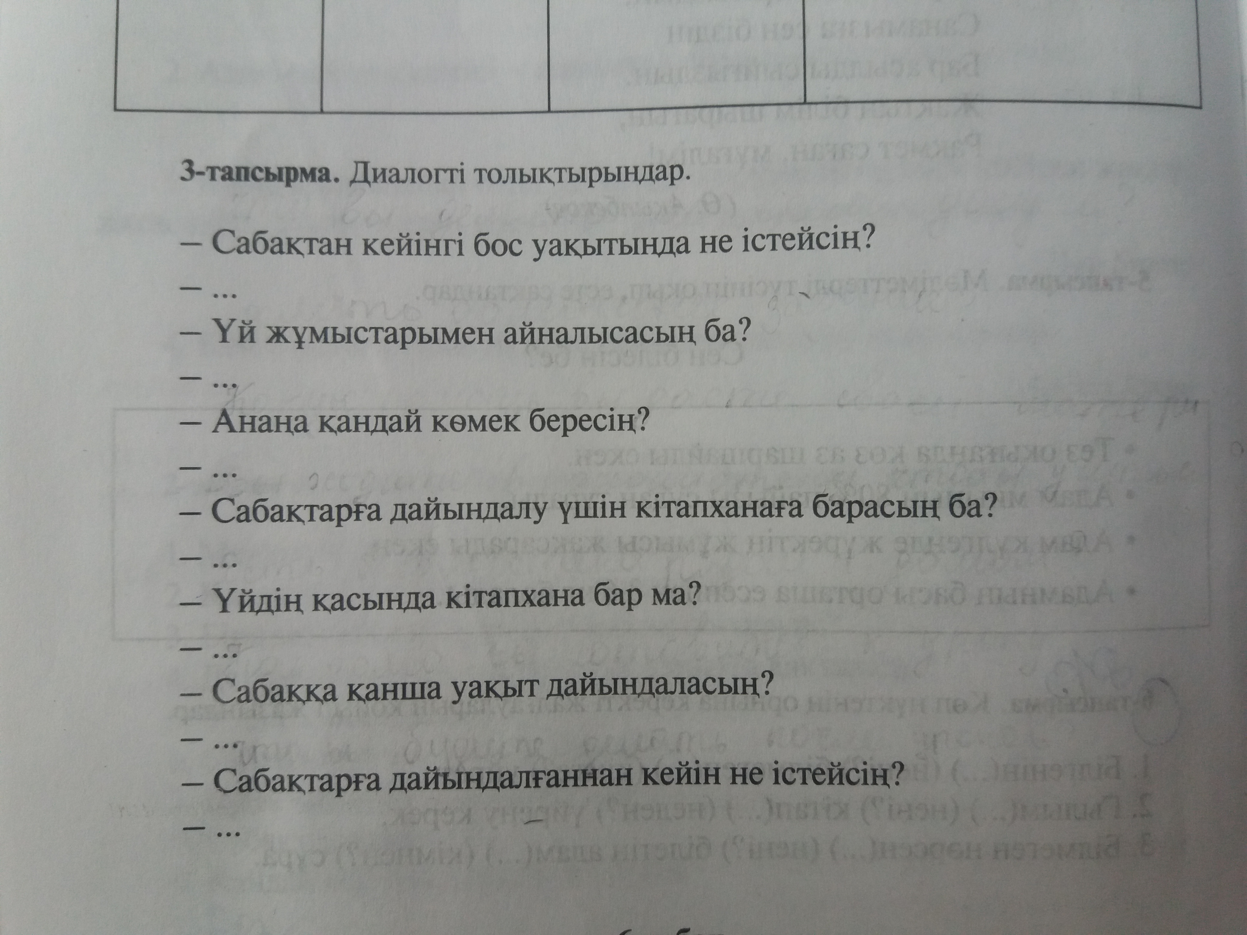 Тут спрашивают что ты делаешь после уроков в свободное время?! Ответ: бос уакытта мен сурет салам,анама комектесемiн.