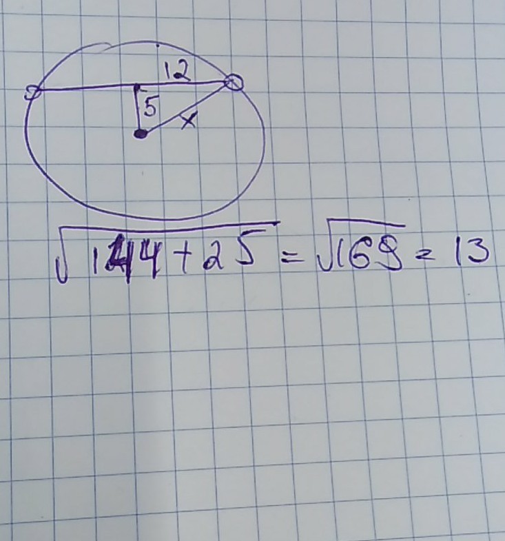проводим от центра хорды прямую к центру окружности, а от центра окружности - к точке хорды (эта прямая - искомый радиус). получаем прямоугольный треугольник, с двумя известными сторонами: один катет равен пяти (по дано), один катет равен двенадцати (половина хорды) теперь по теореме Пифагора находим гипотенузу, которая также является радиусом. ответ:13
