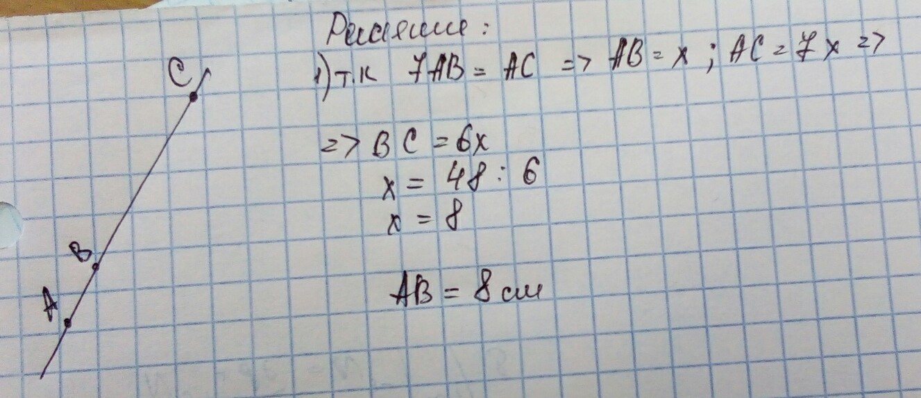 Точки А, В и С лежат на одной прямой, ВС = 48 см, АВ в 7 раз меньше отрезка АС. Найдите отрезок АВ