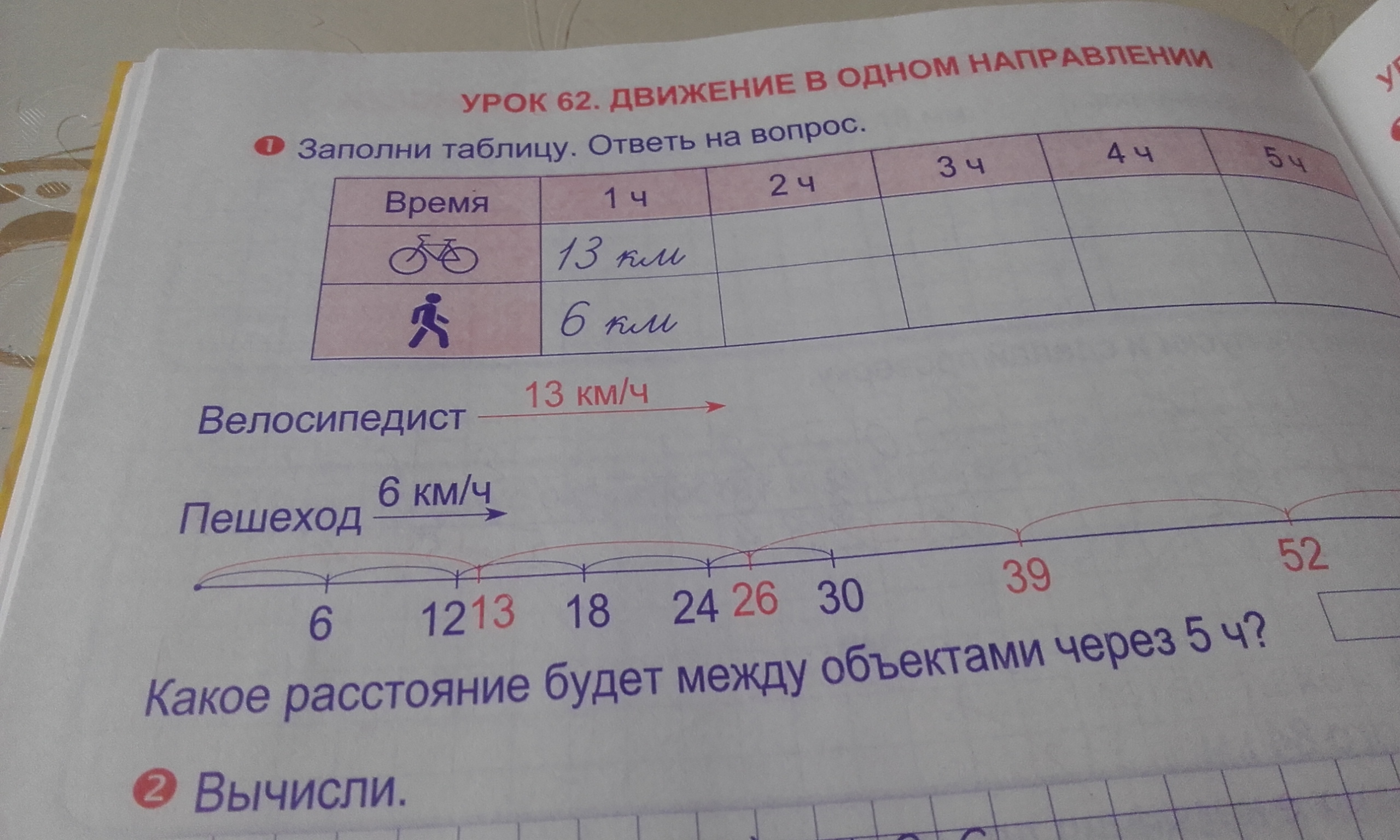 Велосипед через ;2 часа;26 км,через 3 часа ; 39 км, через 4 часа;52 км ,через 5 часов;65 км