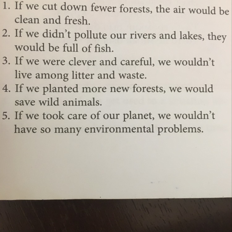 Если мы сократим леса, воздух станет чистым и свежим. Если бы мы не загрязняли наши реки и озёра, они были бы полны рыбы. если бы мы были внимательны и осторожны, мы бы не жили среди мусора и отходов. Если бы на планете было много новых лесов, мы бы жили в безопасности с животными. Если бы мы заботились о планете, мы бы не имели так много экологических проблем. Первое предложение очень странное, проверь сам