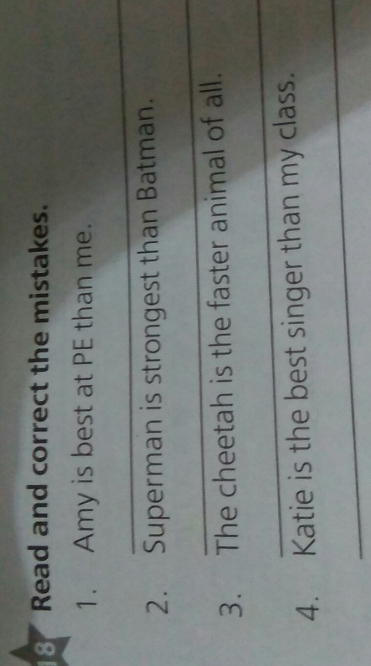 1.Amy is BETTER at PE than me. 2.Superman STRONGER than Batman. 3.The cheetah is the FASTEST animal of all. 4.Katie is the best singer IN my class.