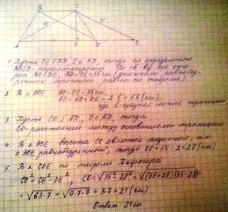 Найдите площадь равнобедренной трапеции с основаниями, равными 30 см и 6 см, боковой стороной, равной 20см.и рисуноок