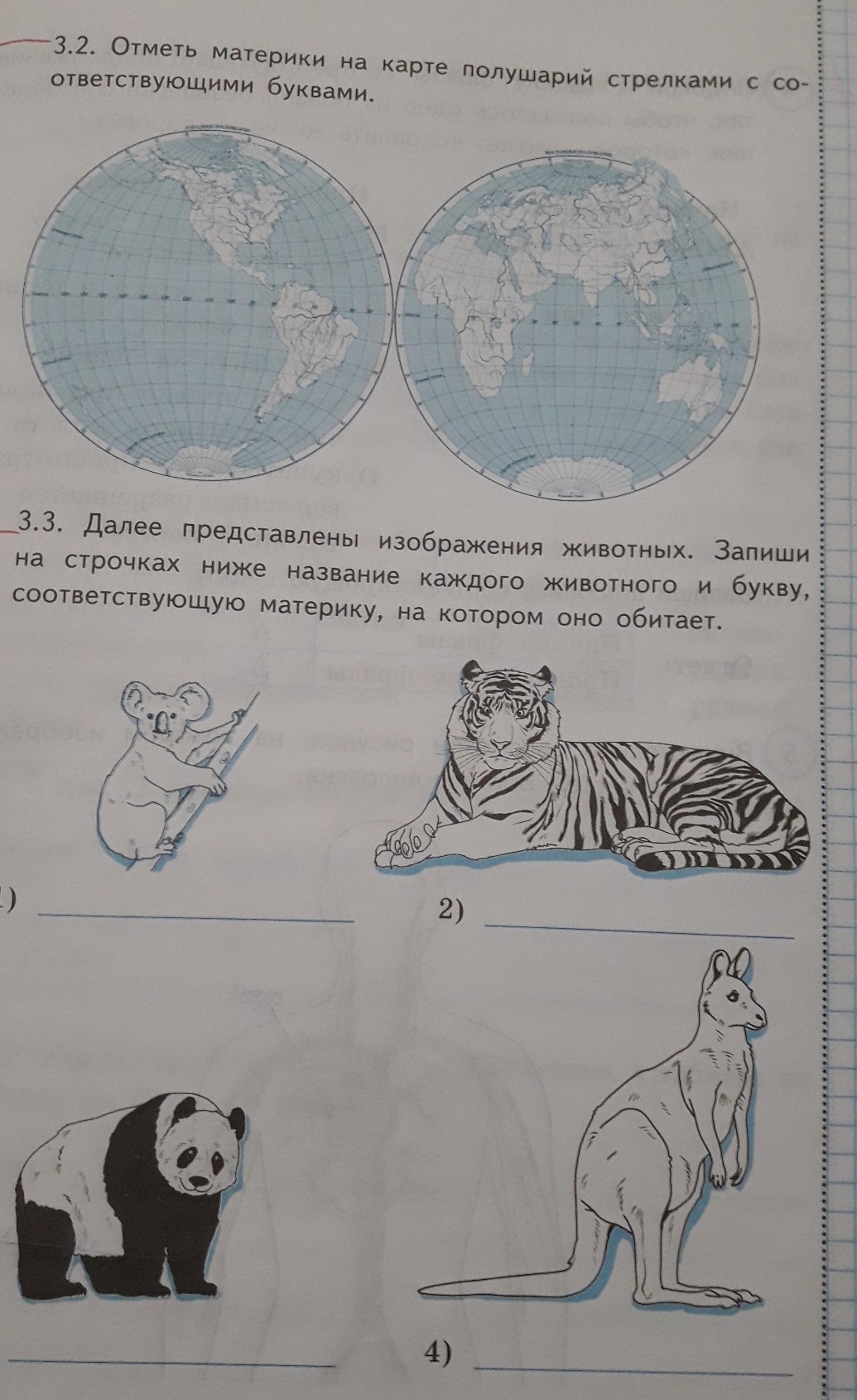 Запиши ниже название каждого животного и букву,соответствующую материку, на котором оно обитает.