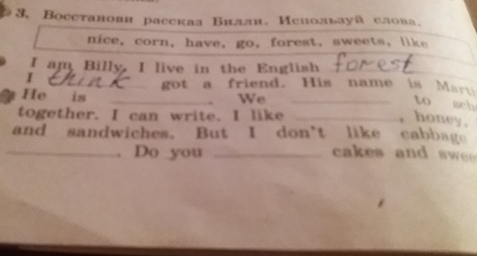 He is nice.we go to school together. I like sweets, honey and sandwiches. But I don't like cabbage and corn.Do you like cakes and sweets. И там в предложении I think got a friend ошибка,там не think, там have.