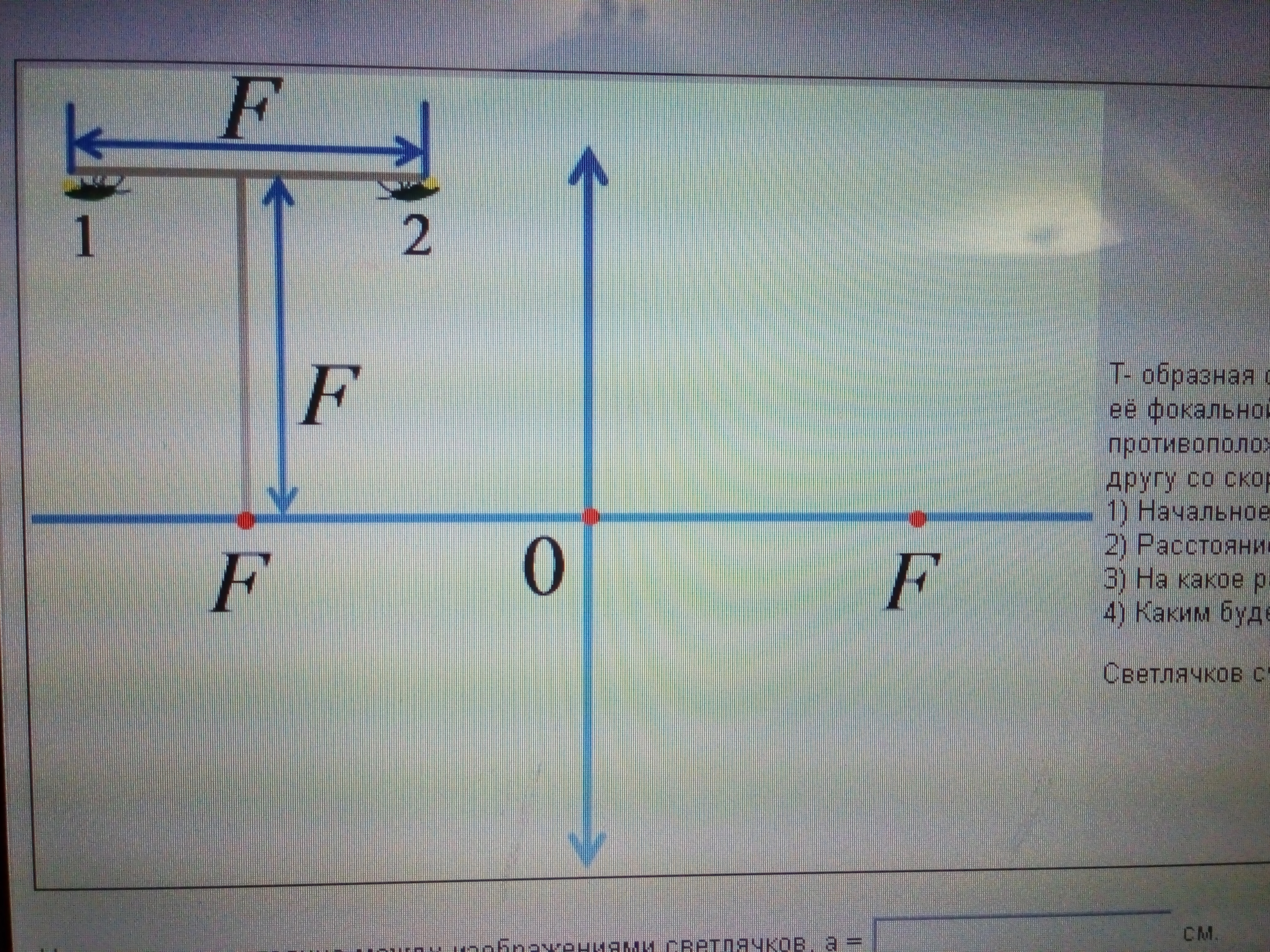 Т-образная опора из двух очень тонких палочек одинаковой длины установлена перпендикулярно оптической оси собирающей линзы в ее фокальной плоскости. Длина каждой из палочек равна фокусному расстоянию линзы F=55,5 см. Два светлячка сидят на противоположных концах горизонтальной палочки. В момент начала отсчета времени они начинают ползти друг навстречу другу со скоростью 0, 7 см/с. Определите: