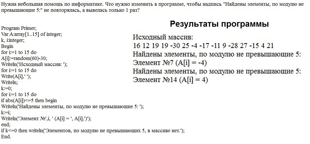 Вынести Writeln('Найдены элемент, по модулю не превышающие 5: '); за цикл for.