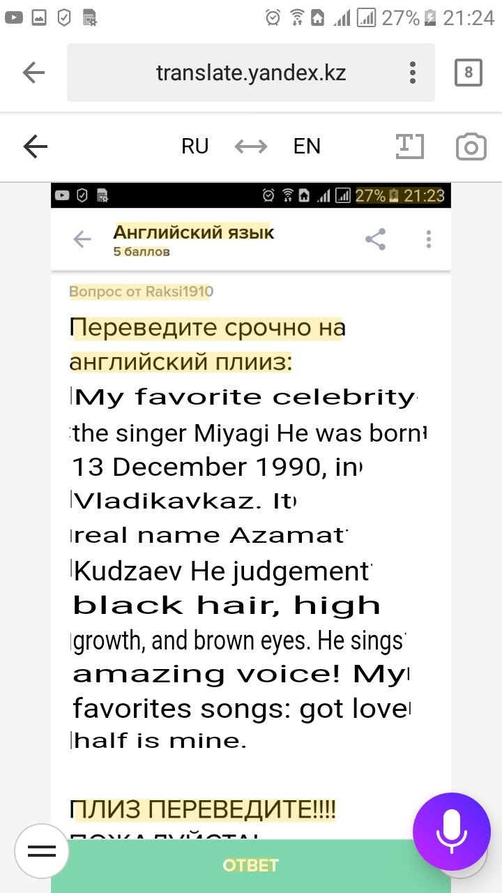My favorite celebrity is the singer Miyagi. He was born on December 13, 1990, in Vladikavkaz. His real name is Azamat Kudzaev. He is thin, has black hair, tall stature and brown eyes. He sings in a terrific voice! My favorite songs: I got love and Half my.