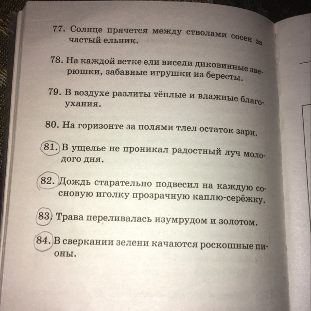 82. Старательно- обстоятельство. На каждую сосновую- определение. Иголку- дополнение. Прозрачную- определение. Каплю-серёжку - дополнение.