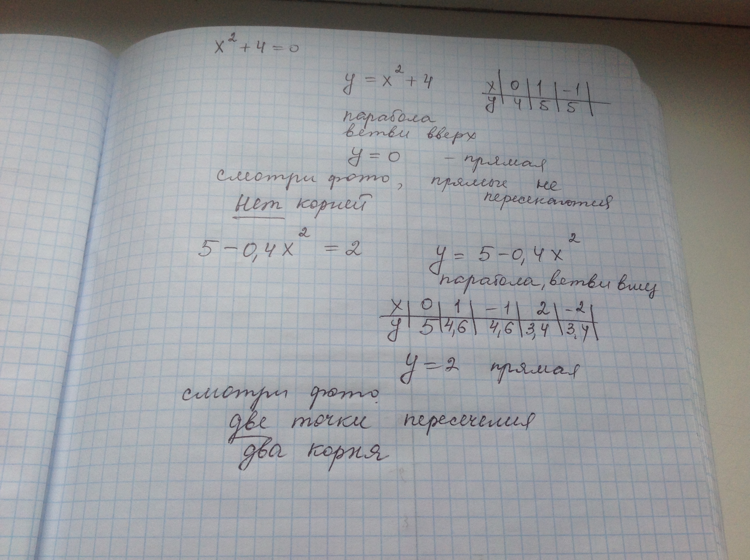 используя графики функций найдите число корней уравнения 1) х во 2 степени + 4 = 0 3) 5 - 0.4 х во 2 степени = 2