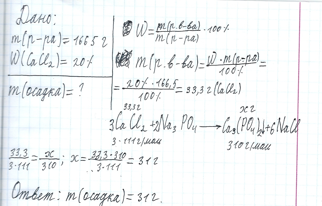 Масса раствора хлорида кальция 166,5 грамм и массовой долей 20% смешали с избытком раствора фомфата натрия. Определите массу выпавшего осадка