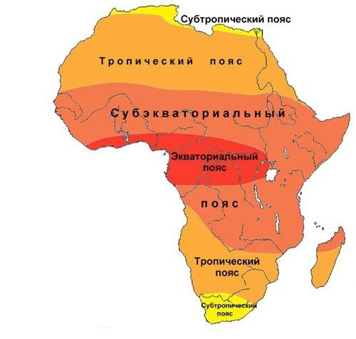 1)Экваториальный климатический пояс Африки.Экваториальный пояс занимает площадь вдоль.Гвинейского залива и проходит вплоть до впадины в Конго и озера Виктория.Целый год здесь преобладает экваториальная теплая воздушная масса, которая определяет погодные условия.В этой части Африки нет времен года с перепадами температур и