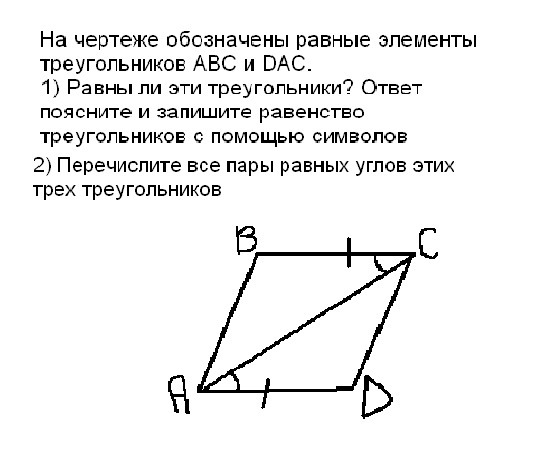 Дано: тр. АВС, тр. АСD, BC=AD, AC - общая сторона, угол CAD=уголBCA.