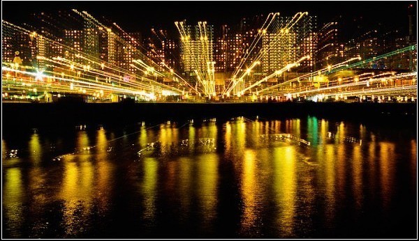 В городе темно. Весь город светится огоньками. Машины ездят по мостам. Все люди спят. Парки ярко светятся. В городе красиво.
