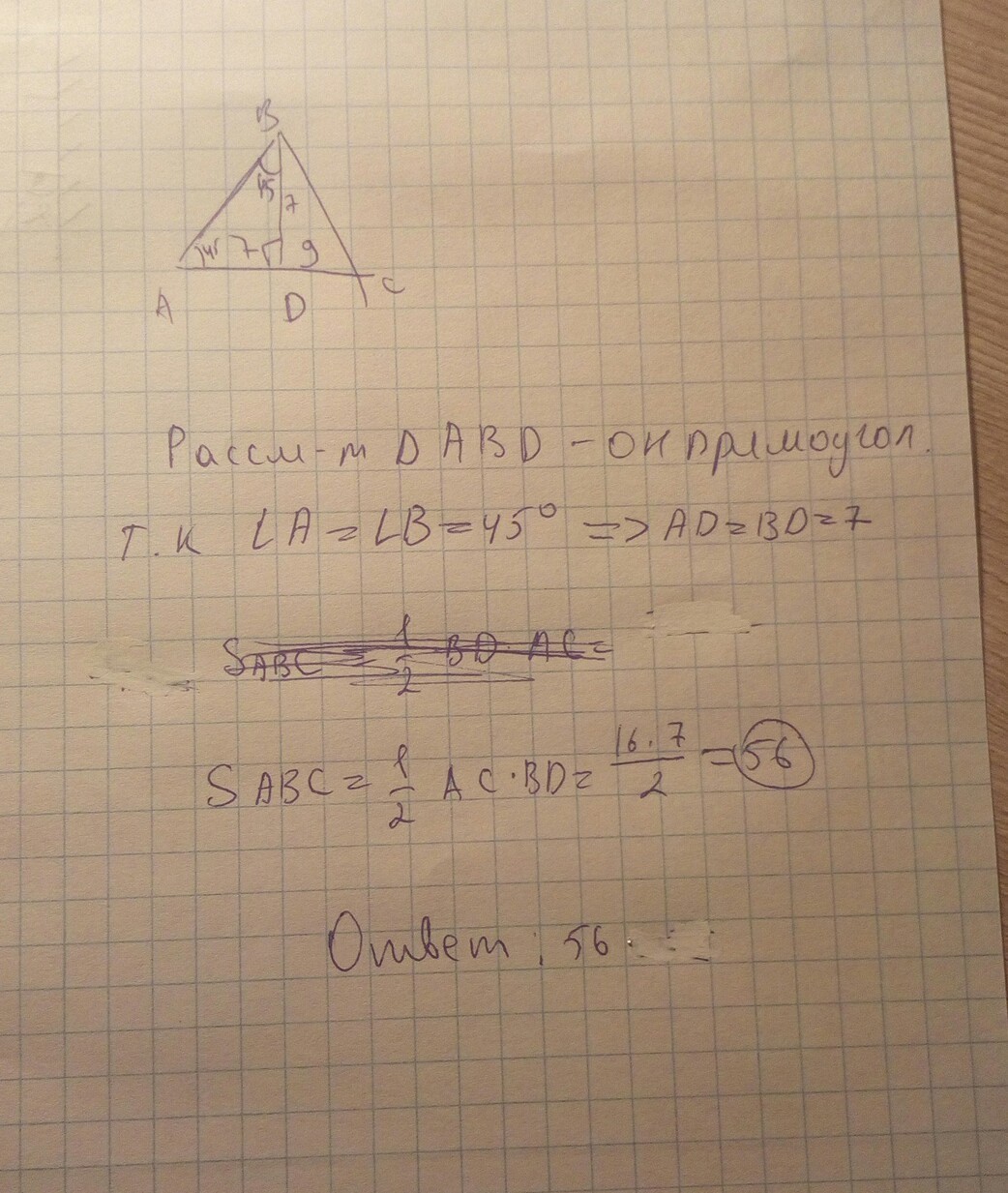 Высота ВD ∆ABC разбивает основание АС на отрезки АD=7 см, DC=9 см, угол А=45°. Найдите площадь ∆АВС.