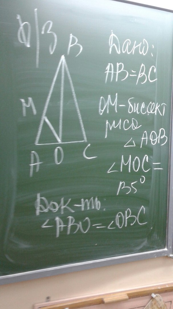 Дано: AB=BC...OM-биссектриса..треугольник AOB угол MOC=B5 градусов...док-ть: угол ABO=углу OBC
