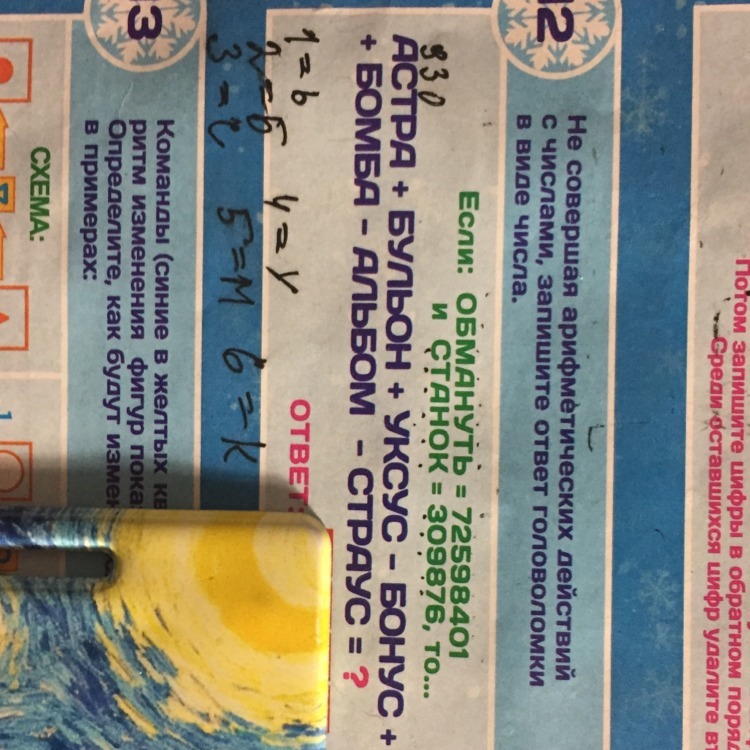 Сокращает буквы в примере, останутся четыре буквы (а, у, к, б). Каждой букве соответствует определённая цифра в словах, например Б вторая по счету в слове "обмануть", А третья в "станок" и четвёртая в "обмануть" и ей соответствует число 9 и т.д. Получаем: