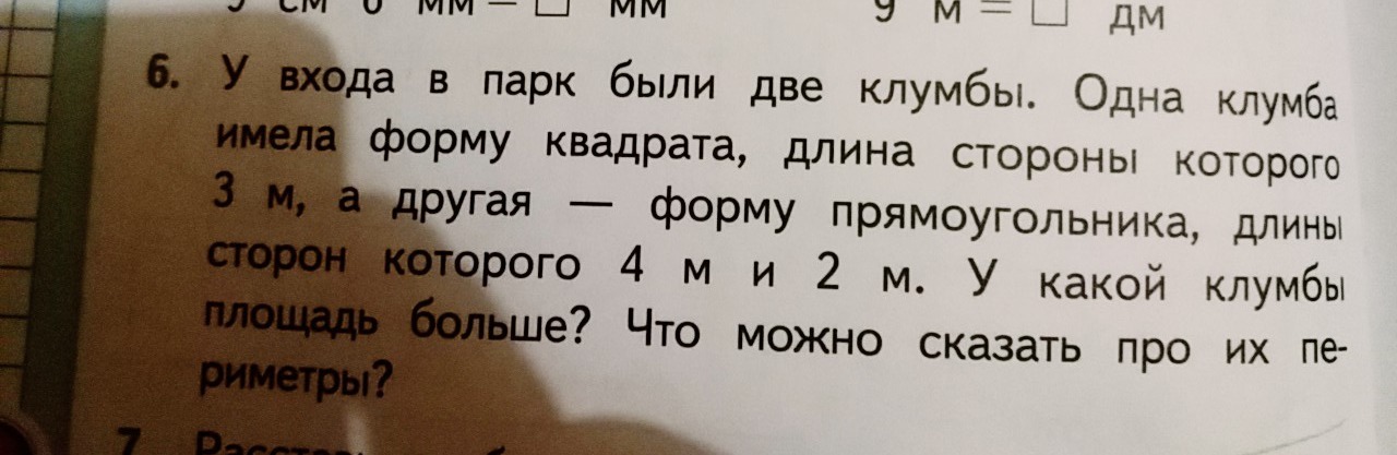 3*3=9m^2-S14*2=8m^2-S29-8=1m3+3+3+3=12 м4+4+2+2=12 мОтвет: Площадь первой клумбы больше на 1 метр, периметры равны.