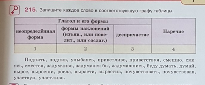 Формы наклонений - смеется, задумался бы, буду думать, думай, вырос, росла, вырасти.