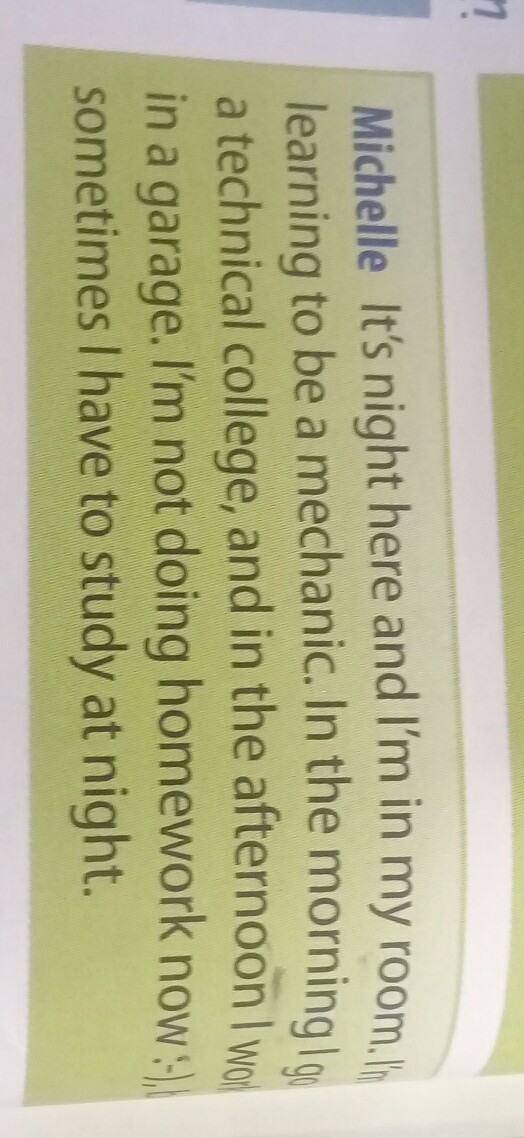 Мишель сейчас ночь и я в своей комнате.Я учусь чтобы стать механиком.Утром я пойду в техничный колледж, а в день я работаю в гараже.Я не делаю сейчас д/з, иногда я должен учится ночью.