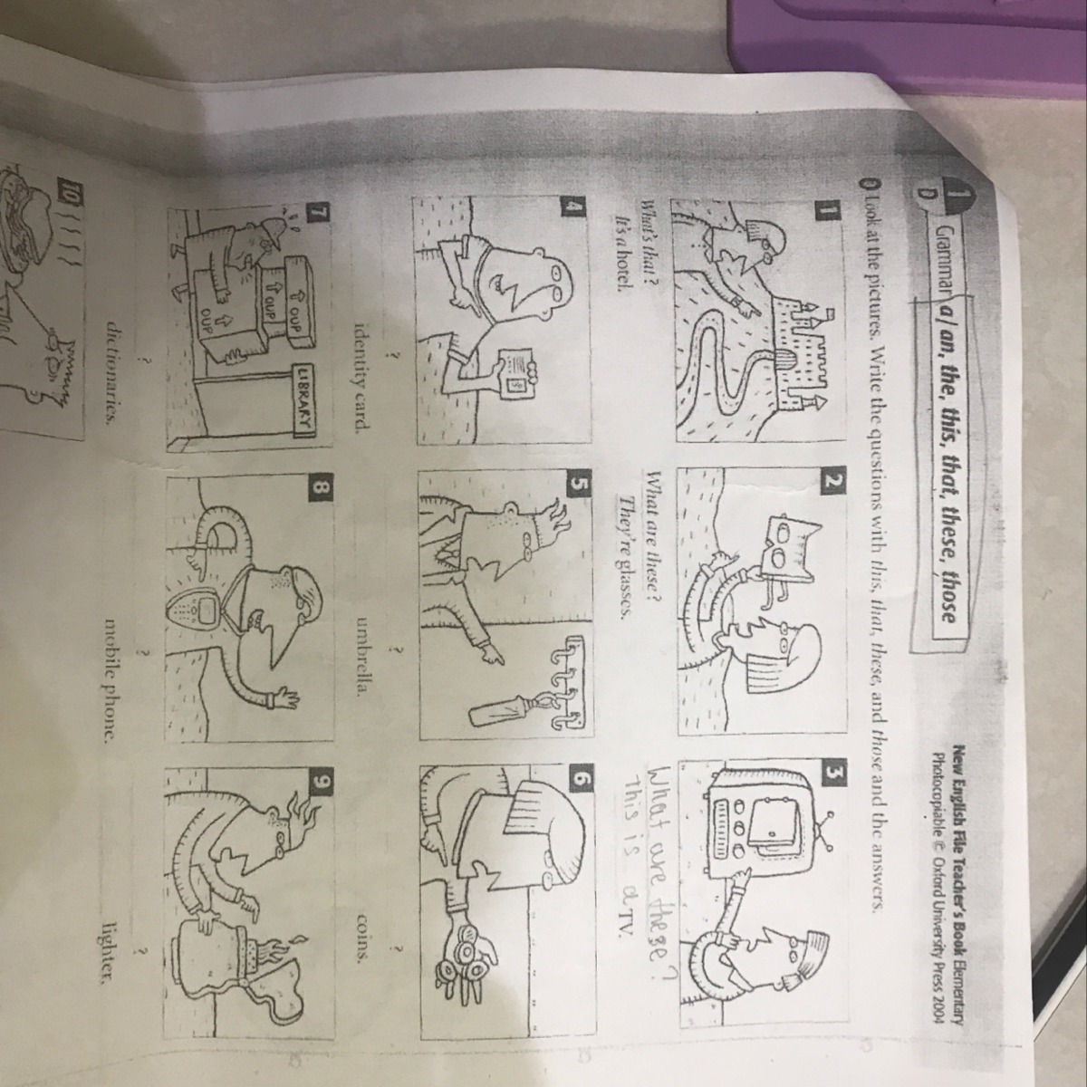 3. What's that? - It's a TV 4. What's this?- It's a identity card 5. What's that? - It's an umbrella 6. What are these? - These are coins 7. What are these? - These are dictionaries. 8. What's this?- It's a mobile phone. 9. What's that?- It's a lighter