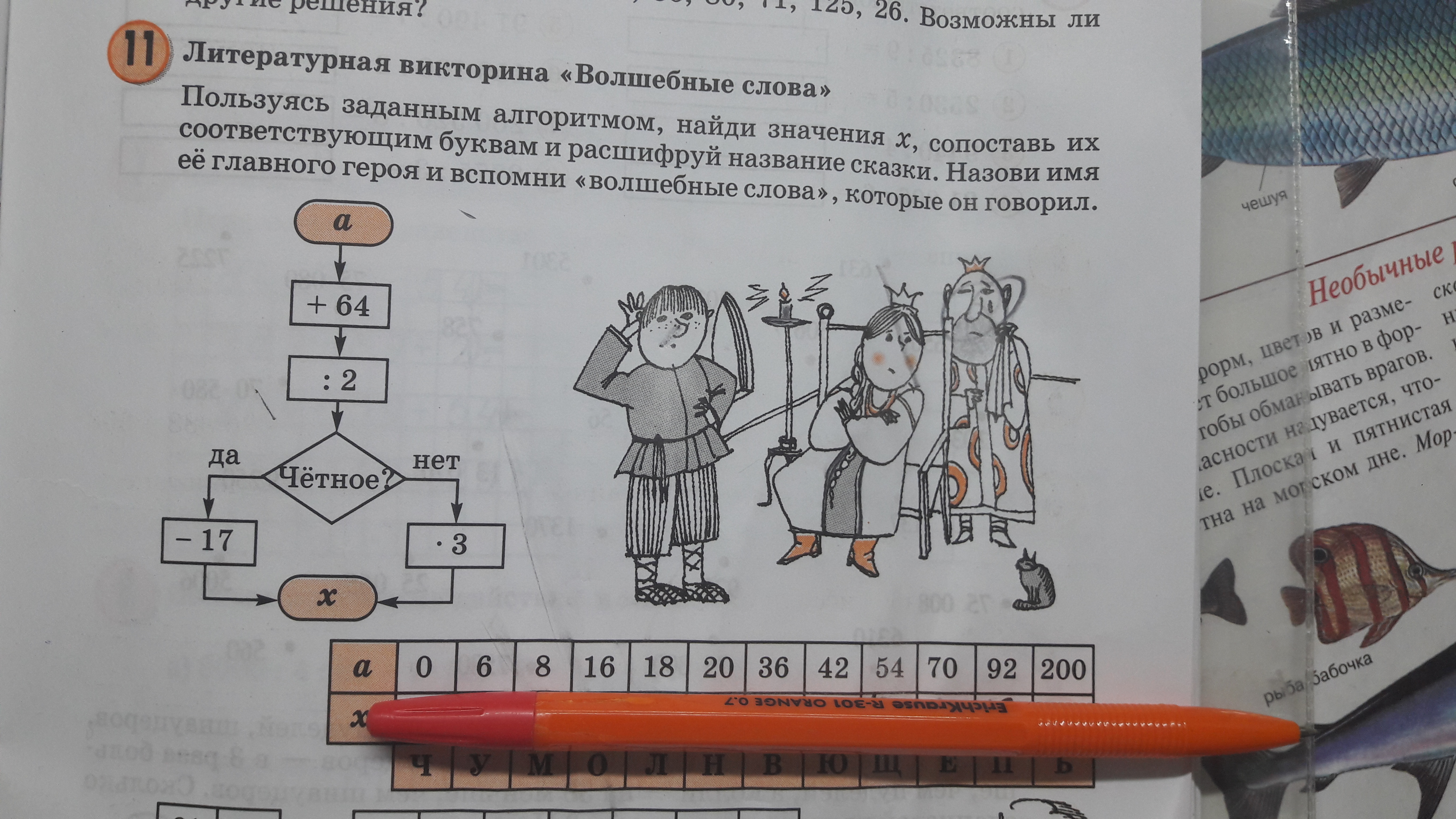 Пользуясь заданным алгоритмом, найди значения х, сопоставь их соответствующим буквам и расшифруй название сказки.