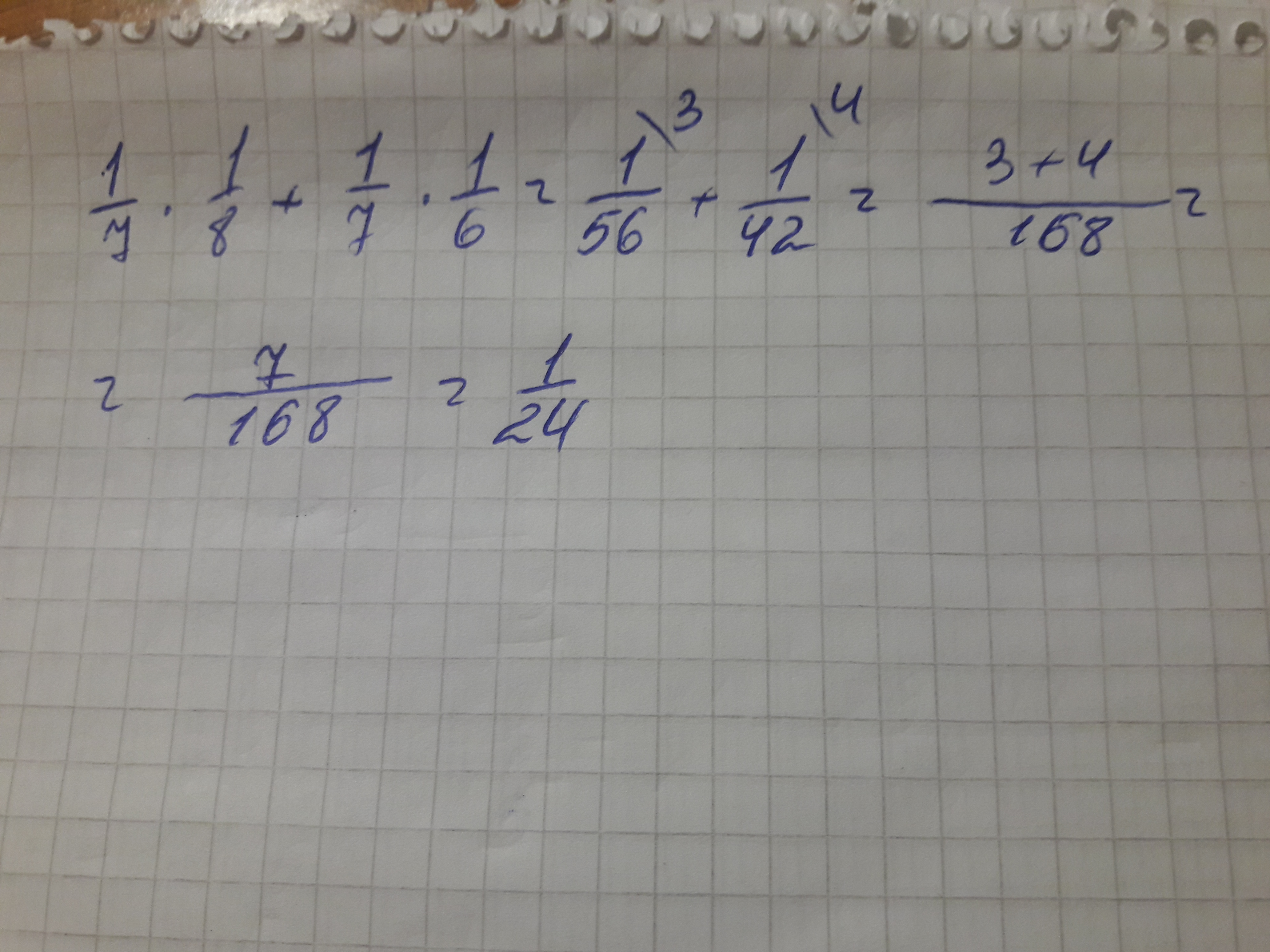 1/7*1/8+1/7*1/6=1/7*(1/8+1/6)=1/7*7/24=1/24