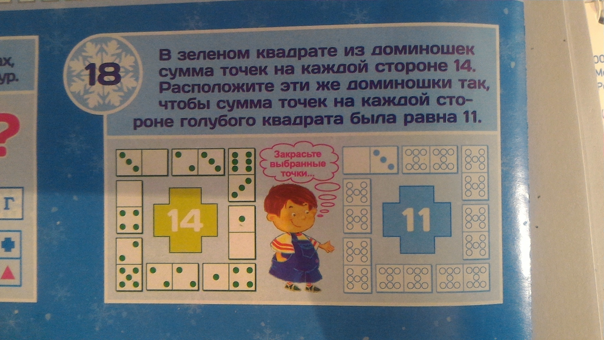 В зеленом квадрате из доминошек сумма точек на каждой стороне 14. Расположите эти же доминошки так, чтобы сумма точек на каждой стороне голубого квадрата была равна 11.
