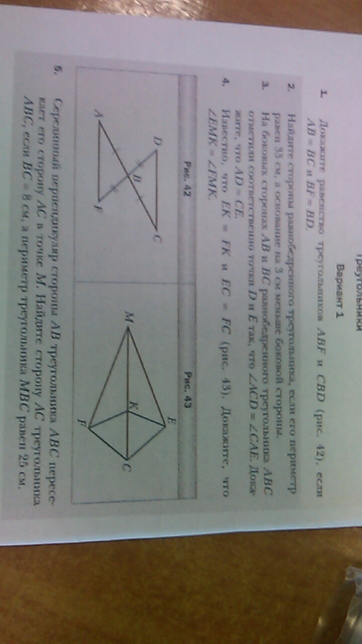 До-во: BA=BC, DB=BF по условию. ,угл.ABD=угл. СBF( вертикальные), значит треу. АBF= треу. СBD( по двум сторонам и углу между ними).