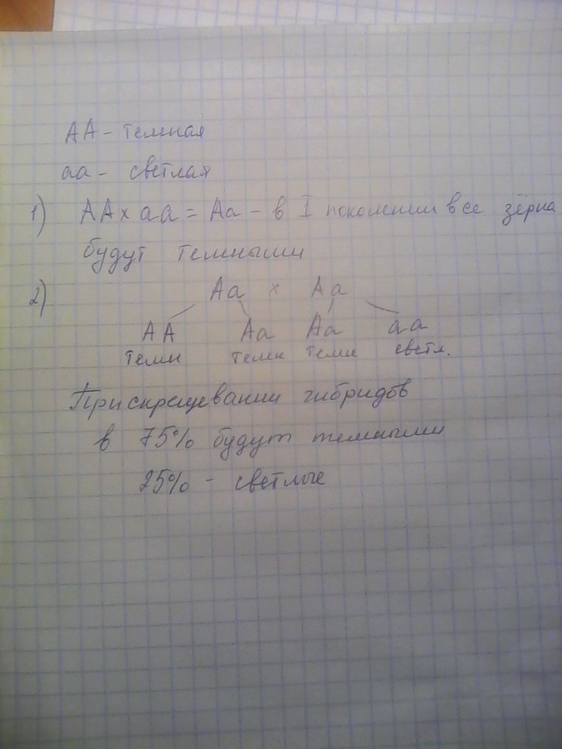У кукурузы темная окраска зерна доминирует над светлой. Какая окраска зерна будет у кукурузы, полученной от скрещивания гомазиготной темнозерной формы со светозерный? Что получится от скрещивания между собой таких гибридов ?