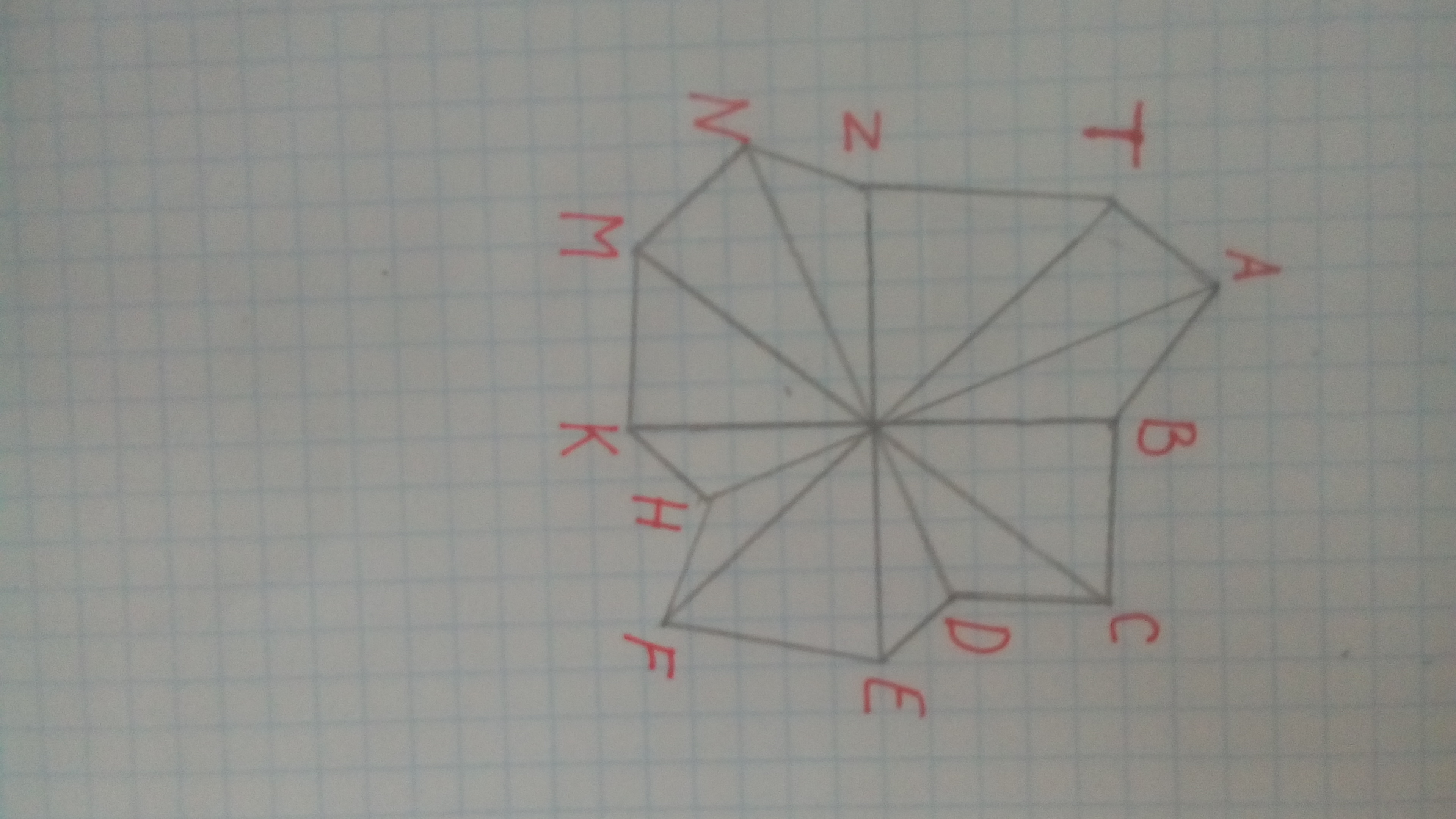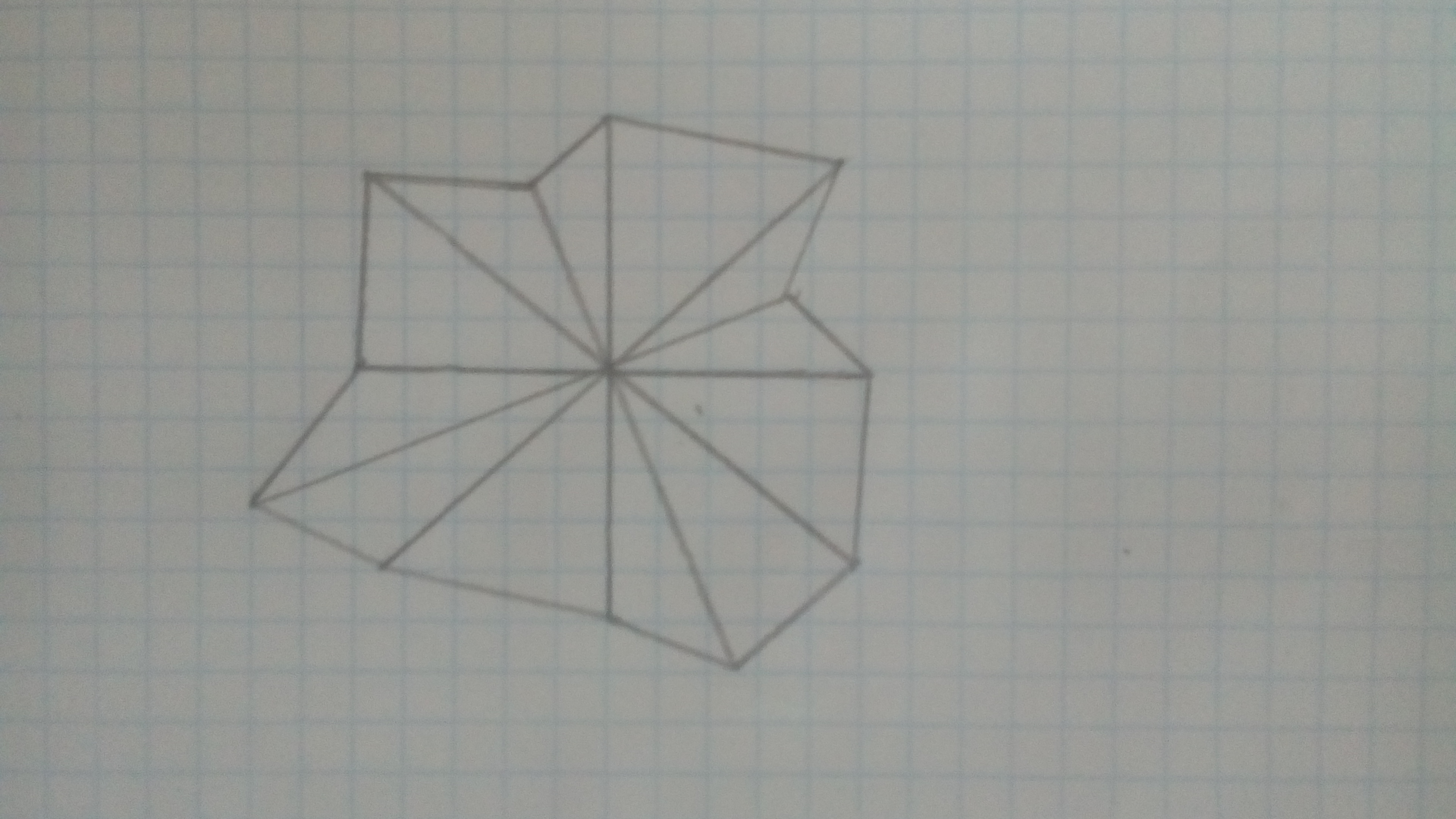 Для начала нужно начертить 6 отрезков , пересекающихся в одной точке. После чего соединяем их концы , и обозначаем многоугольник.